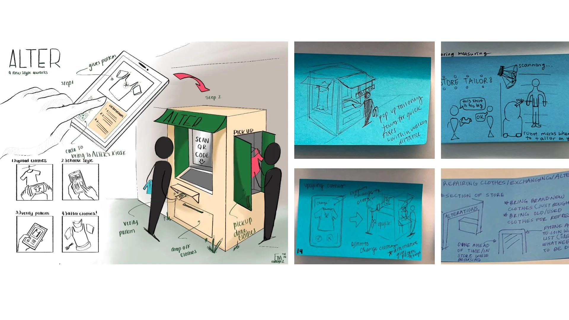 ALTERA is an interactive kiosk which allows the user to scan an item from their wardrobe and explore various alterations for that item through a robust generative ai database, and then have that item be altered according to their selections.