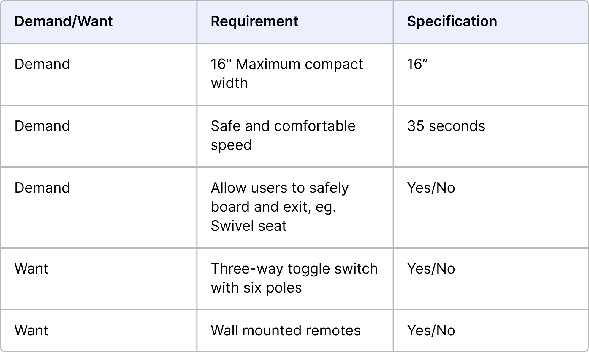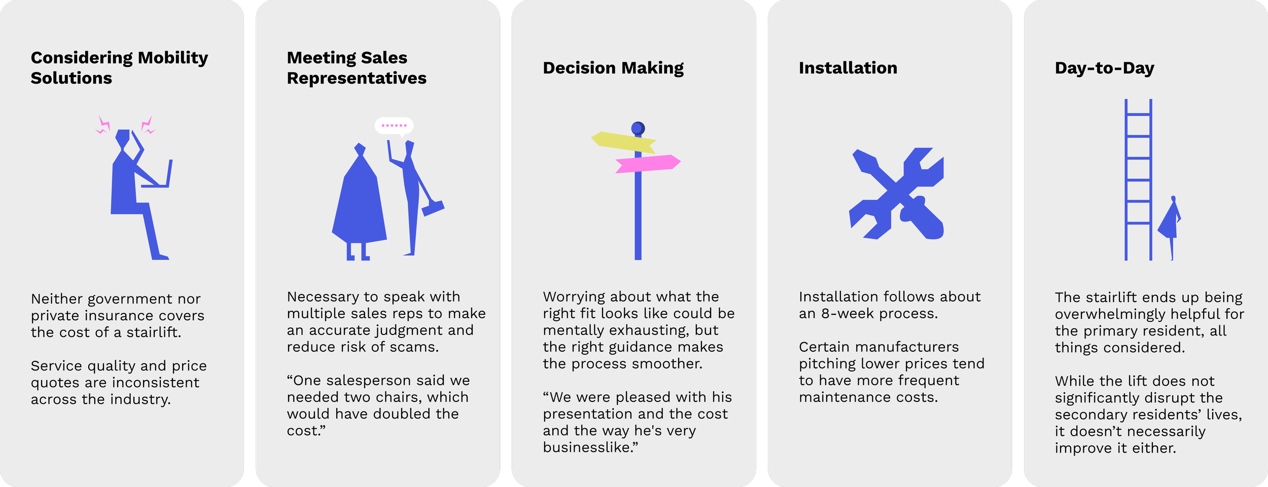 We conducted several interviews with stairlift owners as well as with a stairlift salesman to better understand the product as it stands. This led us to discovering there is a huge service design opportunity that could be explored in further iterations of the project. Major service pain points were during the research phase of making a stairlift purchase. The major product pain points which we chose to focus on involved the secondary resident, and the limited load carrying capabilities.