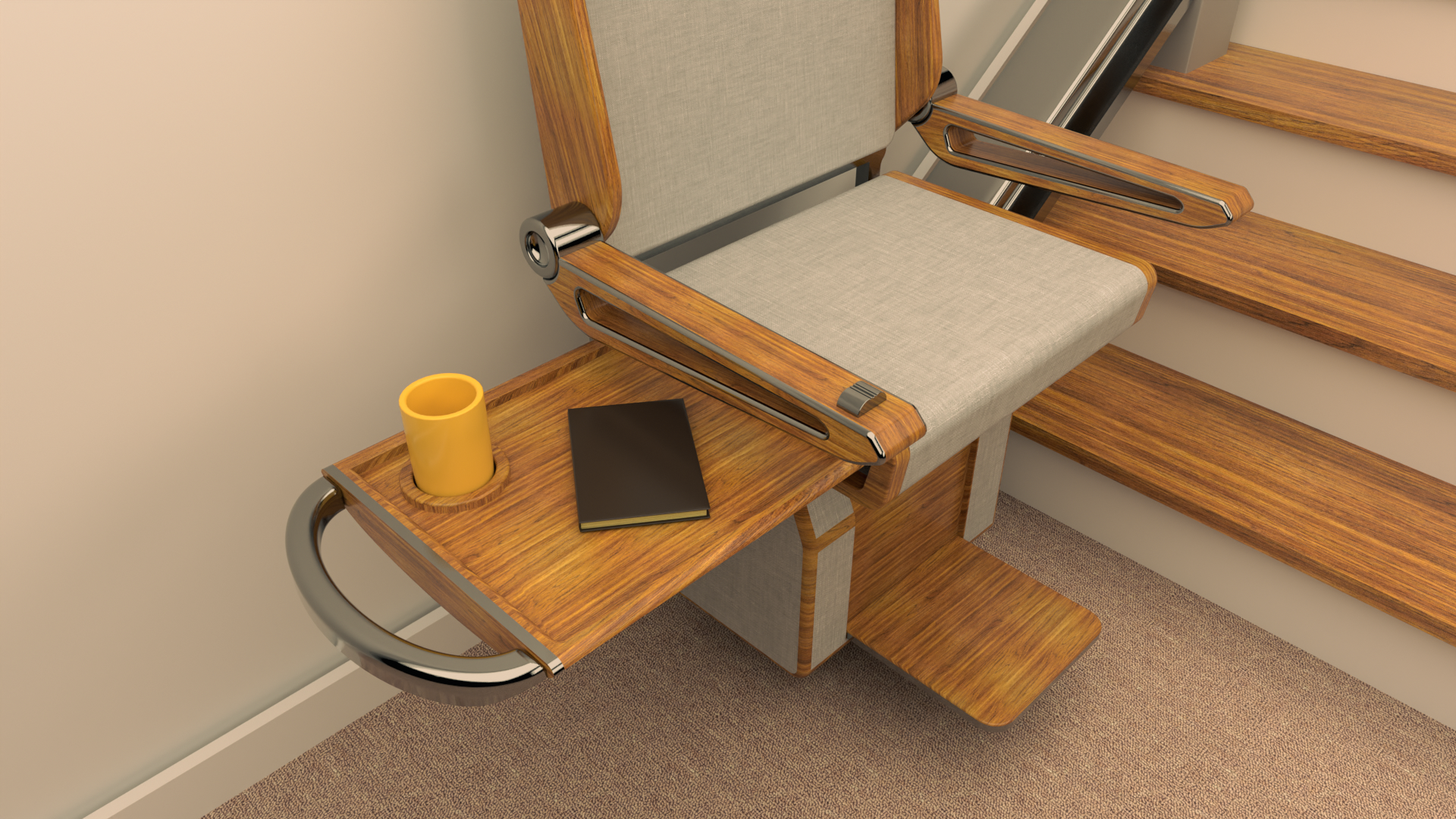 Perch is a multi-functional stairlift designed to meet the evolving needs of multi-generational households. Perch’s features respond to both primary and secondary residents’ unmet needs without being significantly more expensive than existing market offerings. Featuring a retractable tray, Perch is able to carry personal items while a rider is seated in the chair. Additionally, the backrest folds into a platform to carry heavy loads such as laundry or luggage, transforming into a shared household asset.